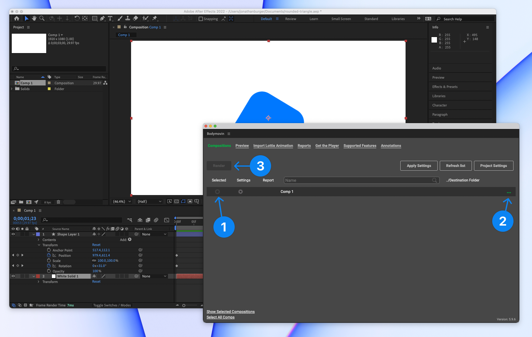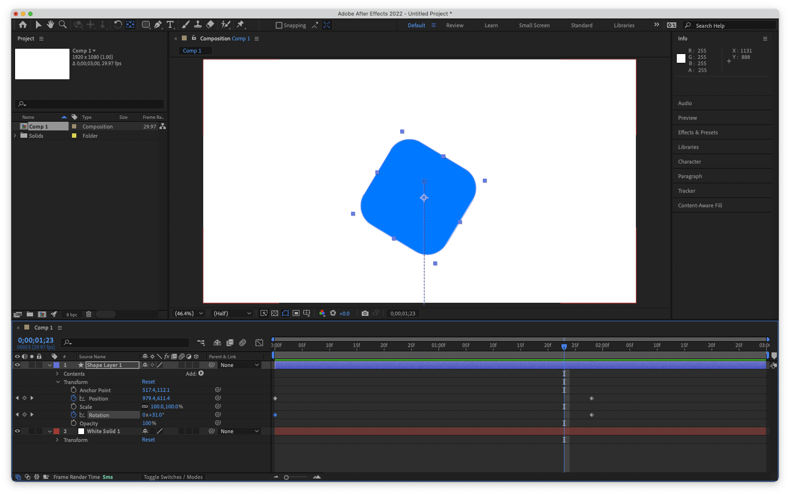 Design your animation in After Effects. In this basic example, we used the rounded rectangle tool to draw a blue rounded square and then opened the transform menu and clicked the stopwatch icon to set keyframes for position and rotation to create a simple entrance effect.
